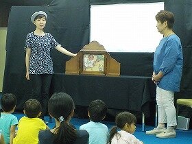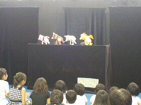 「風のぶらんこ」による紙芝居や人形劇「おむすびころりん」に、子どもたちは釘付け。腹話術では「おしゃべりブッチー」とのやりとりに大喜び。笑顔がいっぱいのおたのしみ会でした。