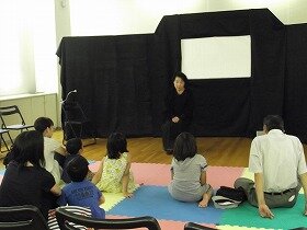 絵本創りのきっかけとなった出来事を解説中 紙芝居の読み聞かせの様子