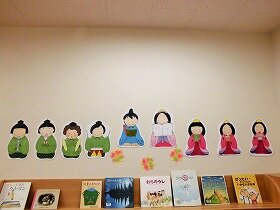 冬の寒さがゆるみ、やっと春の気配が感じられるようになりました。3月3日はひな祭りでしたね。山田駅前図書館の絵本コーナーでは、お内裏様と三人官女が今もにっこり微笑んでいます。