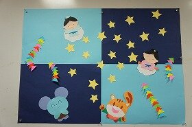 ちさと(千里山・佐井寺図書館)えほんコーナーの壁面は、クリスマスの夜を迎えています。キラキラ光る星の間を、トナカイのソリに乗ったサンタさんがかけていきます。空の下は一面の雪です。モミの木に雪だるま。幻想的な雰囲気が漂っています。