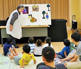 ストーリーテリング「おいしいおかゆ」は、おかゆをどんどん作ってくれる魔法の鍋の物語。耳だけで楽しむお話に、子どもたちは集中して聞いてくれていました。パネルシアターでは「カレーライスのうた」を歌いながら、材料をつぎつぎくわえて、みんなでおいしいカレーを完成させました。絵本「ふしぎなナイフ」に驚いた後は、大型絵本「めっきらもっきらどおんどん」の読み聞かせ。なわとびを跳ぶ場面は、絵本が縦に大きく開いて大迫力。てあそびは、大人も子どもも歌って楽しんでくれ、盛況に終わりました。