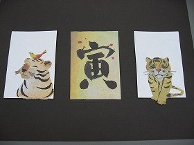 講師の柏原美子氏の作品をお手本にして、クリスマスカードや来年の干支「虎」など好きな図柄を選んで作りました。