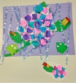 12月10日(日曜日)江坂図書館にて、冬のおたのしみ会「コラージュでクリスマスツリーをつくろう」を開催しました。参加してくれた子供たちはツリーの色や飾りつけの種類など、思い思いに組み合わせて、色とりどりの個性溢れる作品を作っていました。