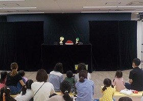 今回の演目として、大阪弁のおはなしと昔話「てぶくろ」、手影絵(てかげえ)が上演されました。参加者は「てぶくろ」では、てぶくろの中に次々と入るたくさんの動物たちを食い入るように見ていました。また「手影絵」では、まねをして一緒に両手を組み合わせたり、動物の名前を当てたりしながら、犬や狐などの動物が次々とスクリーンに現れるのを楽しみました。会場のみなさんが歌に合わせて手拍子をする場面もあり、とても楽しいひとときとなりました。