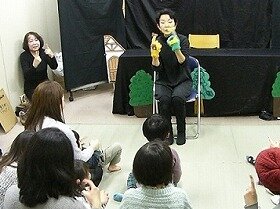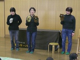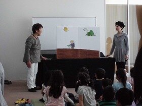 4月23日(土曜日)、北千里地区公民館で「風のぶらんこ劇場」を開催しました。人形劇「なかよし」では、オオカミくんとメリーちゃんのかくれんぼにくすくす。絵本「おおきな おおきな きいろい ひまわり」では、本物の花のように開いていく絵本に目を見張りました。そして、一番の人気は腹話術のブッチーくん。犬のブッチーくんと何のおにぎりが好きかおしゃべりしたり歌をうたって遊びました。