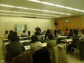「クリスマスは、本来は誕生を祝うもの。クリスマス絵本も生まれてきてくれた喜びを描いたものを主にご紹介したい。」と正置先生。先生の淡々とした中にも、熱の感じられる深い語り口で読まれるクリスマス絵本に受講生のみなさんは、しんとして見入っておられました。日本をはじめ、世界各国の美しいクリスマス絵本を紹介いただき、クリスマスの意味や日々の営みの大切さをふりかえる貴重な時間をみなで分かちあいました。講演終了後は、紹介いただいた数々の絵本をひもといて、その中の何冊かを大事に借りて帰る姿も見受けられました。33名の参加者の方一人一人の心にしみいる1冊や、あの人に贈りたい1冊をみつけていただけたのではないでしょうか。同時開催の「クリスマスポップ絵本ミニ展示」も好評でした。