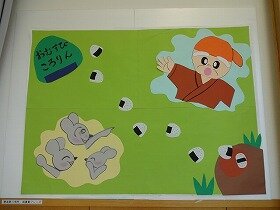 千里図書館の壁面では、子どもたちがお正月あそびをしています。羽子板、凧揚げ...。年賀状を持っている子どももいます。子どもたちが何をしているか、ぜひ図書館で見つけてください。(製作:図書館フレンズさん)