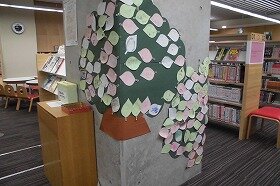 また、3月1日(火曜日)から3月26日(土曜日)までの間、「5周年を記念してメッセージを書こう(描こう)」という催しとして、葉っぱの形をした紙に図書館へのメッセージを書いてもらい館内の大きな木のポスターに貼りました。152枚のメッセージがよせられました。