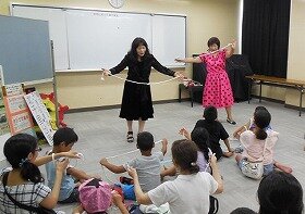 エプロンシアター「おおきなかぶ」では、みんなで一緒に掛け声をかけてかぶを引っ張り、無事抜くことができました。はさみで切ったひもがまた一本につながるマジックなどもありました。そのほか、ペープサート、大きな絵本、おはなしなど盛りだくさんのプログラムを楽しみました。
